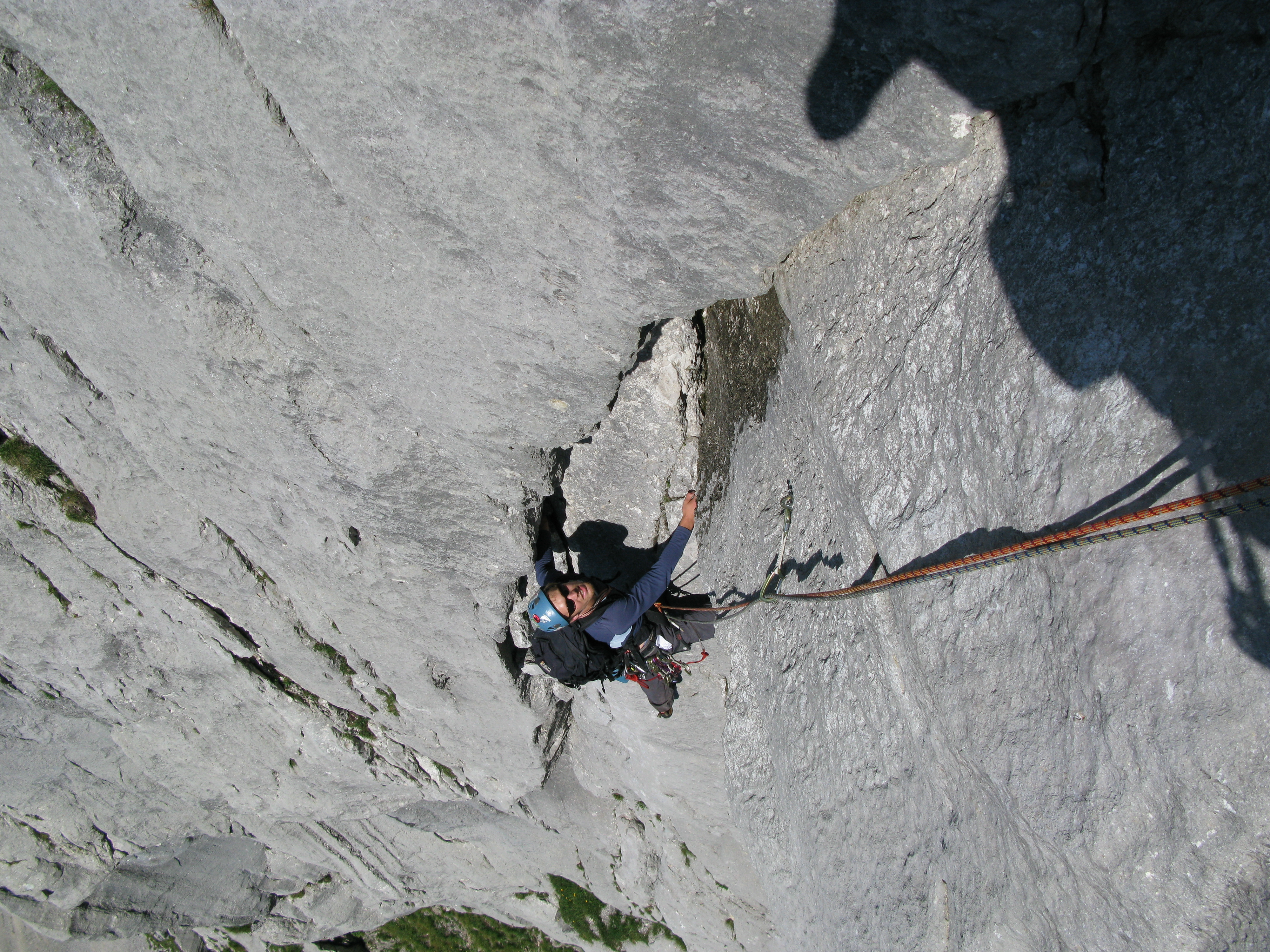 In gleichbleibender Schwierigkeit kommen wir gut voran. Dazwischen kommt die eine oder andere Zwischenlänge von geringer Schwierigkeit, bei denen das Hauptaugenmerk darauf liegt, nicht zu viel von dem losen Gestein auf den Seilpartner zu werfen. Insgesamt sind wir dann doch mehr als fünf Stunden in der Wand. Die Füße sind noch nicht ganz erholt von der letzten Woche, vorallem die Blase an der Ferse drückt. So sind wir beide froh, als wir am Ausstieg angelangt sind.