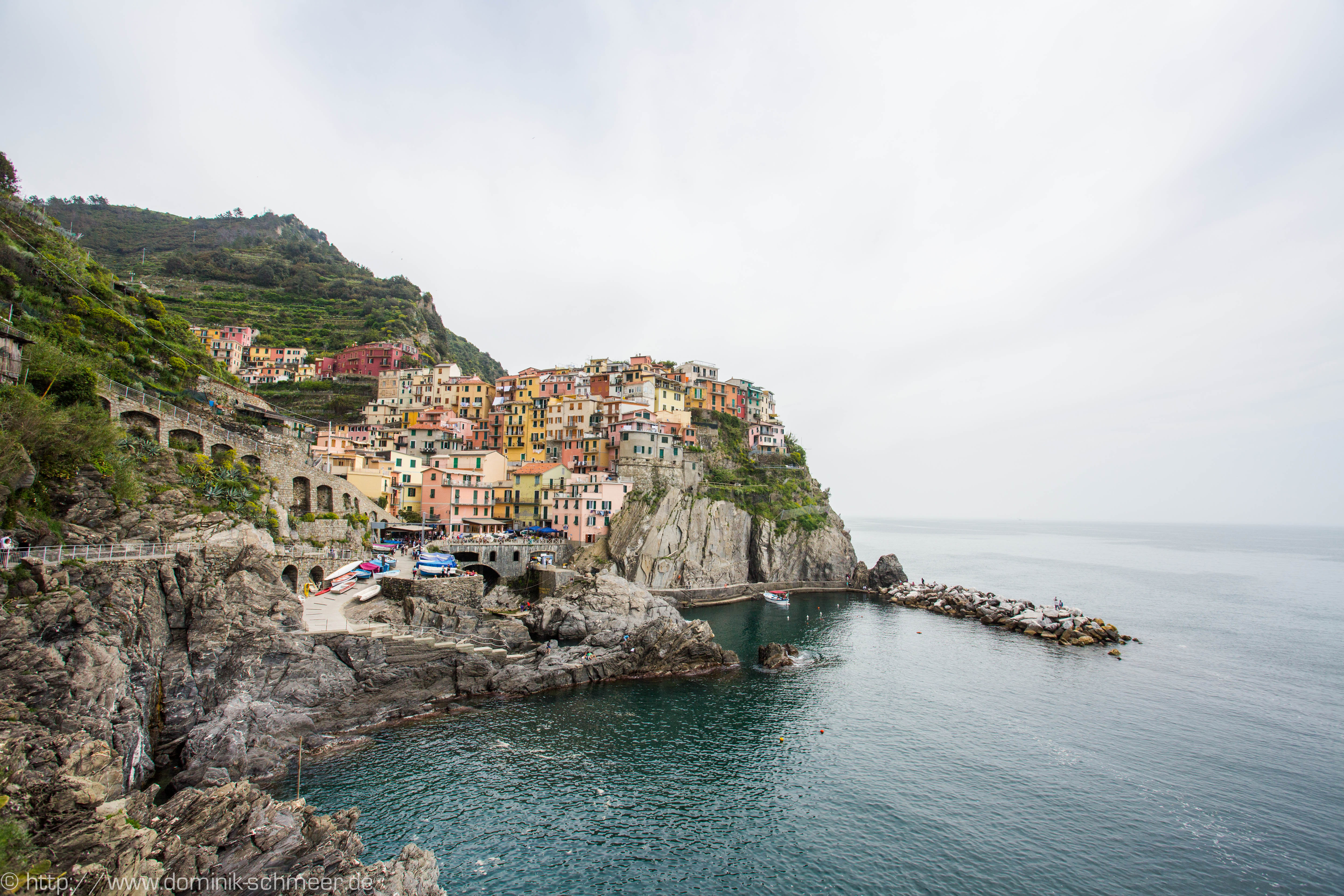 Wenn man Ruhe haben will in den Cinque Terre, reist man am besten im Februar hierher. Anfang Mai ist schon einiges los hier, im Hochsommer sollte man besser keine Berührungsängste besitzen. Weder im Zug, noch auf den Wanderwegen, noch sonst wo. Es gibt einige Möglichkeiten die fünf Orte zu Fuß zu erwandern. Der bekannteste Weg trägt die Nummer 2, immer an der Küstenlinie entlang. Starke Regenfälle in den vergangenen Wochen haben die Erdrutschgefahr so stark erhöht, dass die Verbindungen zwischen Riomaggiore, dem südlichsten Ort und Corniglia, dem Ort in der Mitte, gesperrt ist. So werden wir zu unserem Glück über die Berge „gezwungen“. Den meisten Touristen aus Übersee und sonstwo her ist das scheinbar zu anstrengend und so sind wir doch alleine unterwegs. Zwischen den beiden Orten liegt Manarola. Das Bild des Naturhafens ist wohl schon zigtausend Mal abgelichtet worden, jedenfalls kommt es einem so vor.