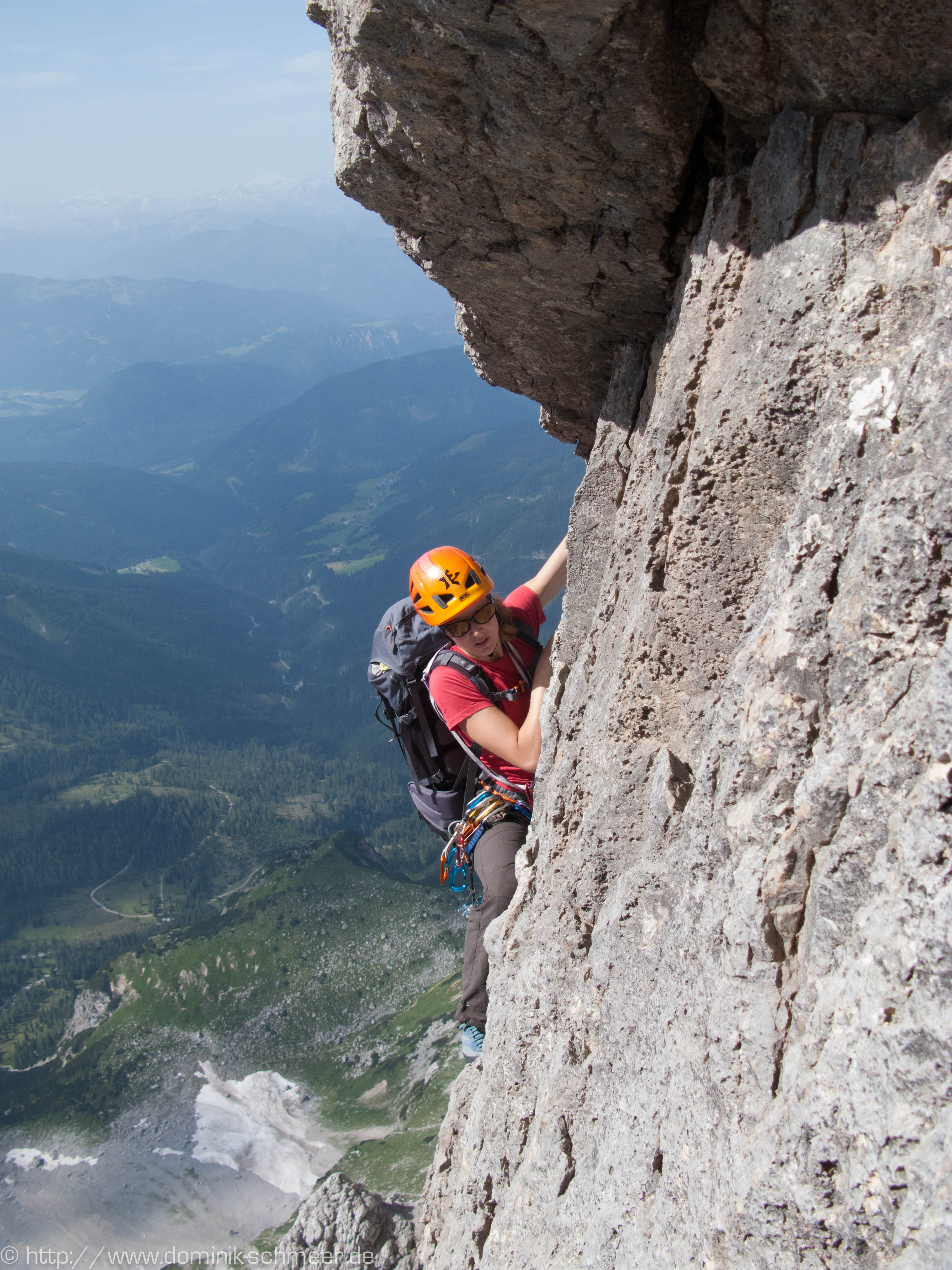 Vor uns eine geführte Dreier-Seilschaft, immerhin müssen wir uns jetzt am Einstieg keine Gedanken um die Wegfindung machen. Auf dem Dachgiebel lassen wir die drei hinter uns. Nach dem Salzburger Band schließen wir zu zwei jungen Österreichern auf. Sie klettern in ähnlichem Tempo, so bleiben wir dahinter. Seillänge um Seillänge geht es nach oben. Gerade im zweiten Teil immer anhalten steil, aber durchwegs gute Felsqualität. Die Absicherung passt auch, trotzdem kein Ort für Unachtsamkeiten. Die Kaminreihen und die Schlüsselseillänge sind zwar mit dem Rucksack am Buckel etwas unkommod, aber alles löst sich schön auf. Nach gut sieben Stunden sind wir oben. Über den Randkluftsteig geht es hinunter auf den Hallstätter Gletscher und zur Bergstation der Dachstein Seilbahn.