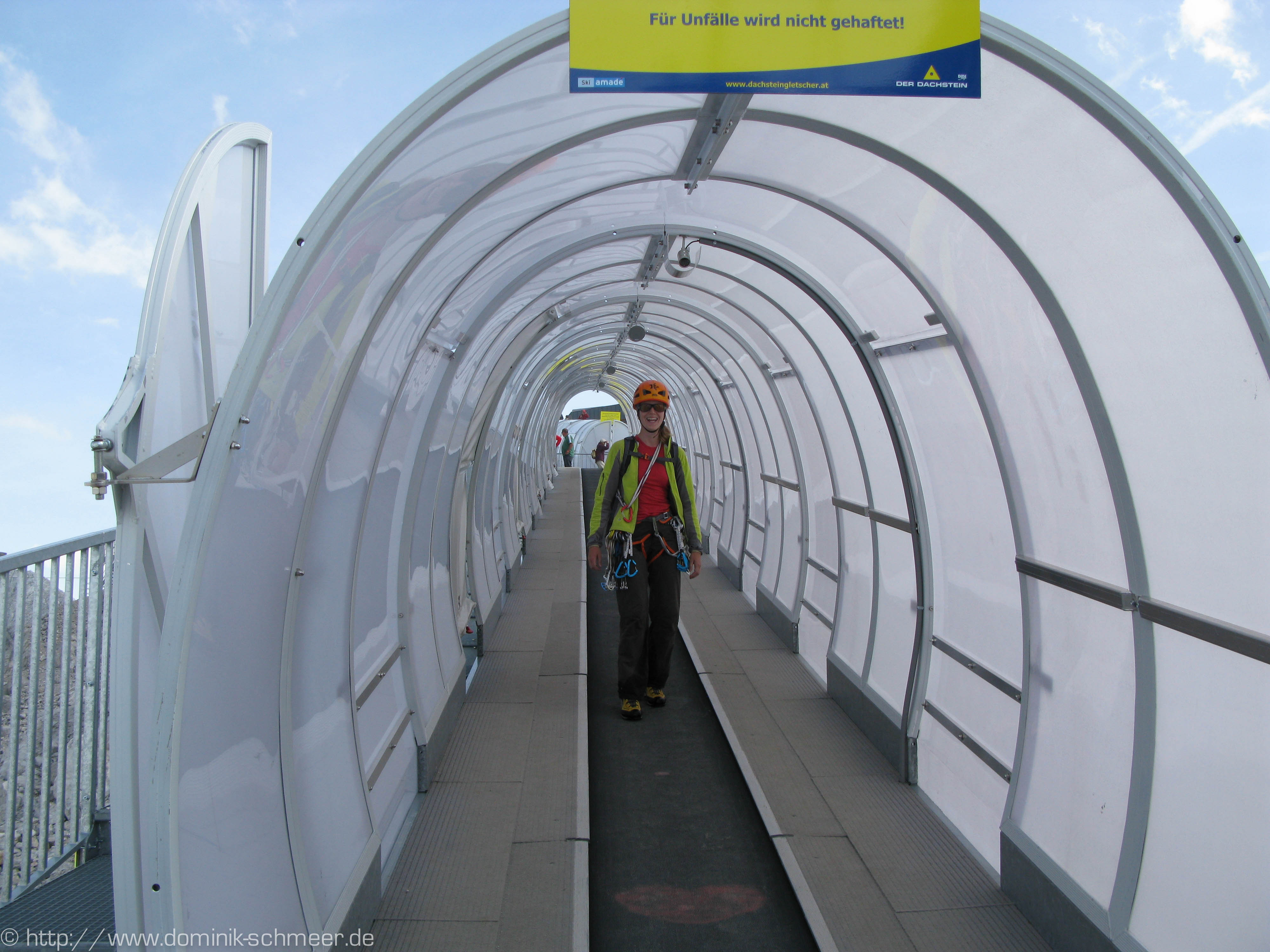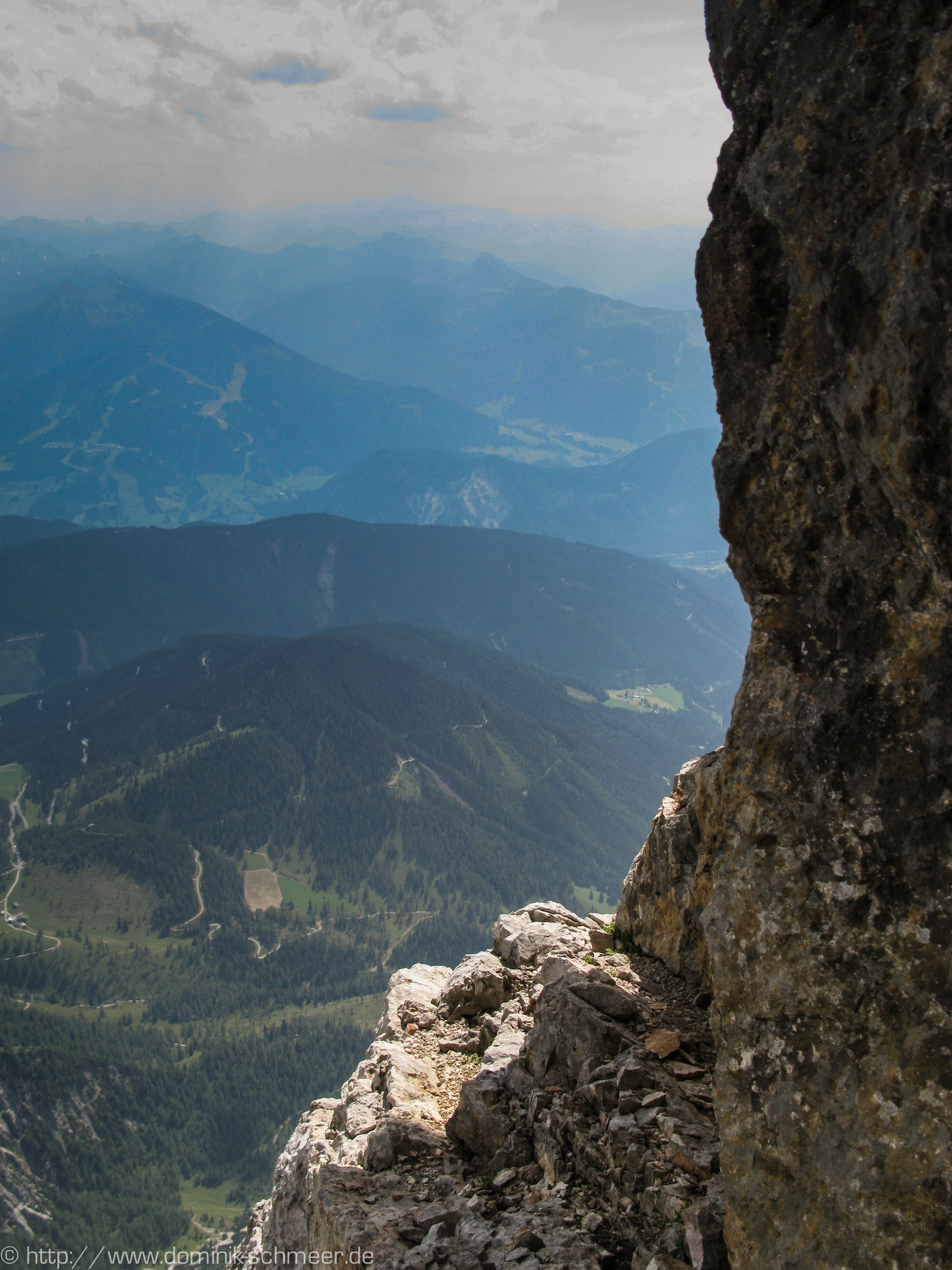 Wir sind zurück in der Zivilisation oder dem, was die Macher von „Der Dachstein“ sich so darunter vorstellen. „Nervenkitzel mit Aussicht“: Der Thrill für die Großstadtabenteurer. Im Kampf um Gäste und Touristen wird die außerordentlich beeindruckende Natur hier oben bis zur Unkenntlichkeit verschandelt und ausgeschlachtet. Hängebrücken, Aussichtsplattform, Sky Walk, Eispalast, Personenförderband mit Blasmusik aus Lautsprechern. So schrecklich, dass man es kaum beschreiben kann. Man muss es gesehen haben, oder nein, halt, besser nicht. Beim Blick zurück wird klar, dass diese Wand trotz ihrer Nähe zu Beton, Glas und Lärm eine andere Welt ist.